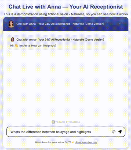 She explains your services in plain English, answers common questions, reassures nervous clients, and guides people towards booking — all without you lifting a finger. Your salon feels open 24/7, even when you’re busy with clients or taking a break.